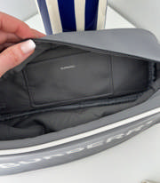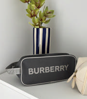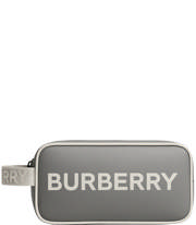 Grå Burberry toilettaske. Tasken har lynlåslukning og en praktisk bærestrop i siden. Velegnet til opbevaring af toiletsager på farten.