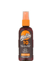 - Få en solkysset glød med Malibu Dry Oil Spray SPF10, der giver let beskyttelse mod solens UVA- og UVB-stråler, samtidig med at den plejer huden. Den hurtigtørrende formel føles let og ikke-fedtet, hvilket gør den behagelig at have på, mens vitamin E tilfører fugt og hjælper med at holde huden blød og smidig.